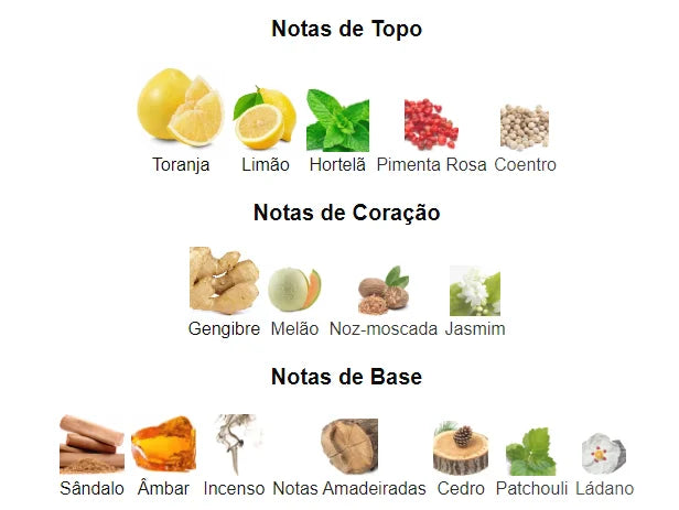 - Coração: Gengibre, Noz-moscada, Jasmim e Melão.