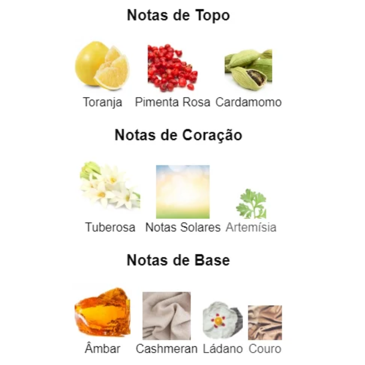 - Topo: Cardamomo, Toranja e Pimenta Rosa (abertura especiada e vibrante).