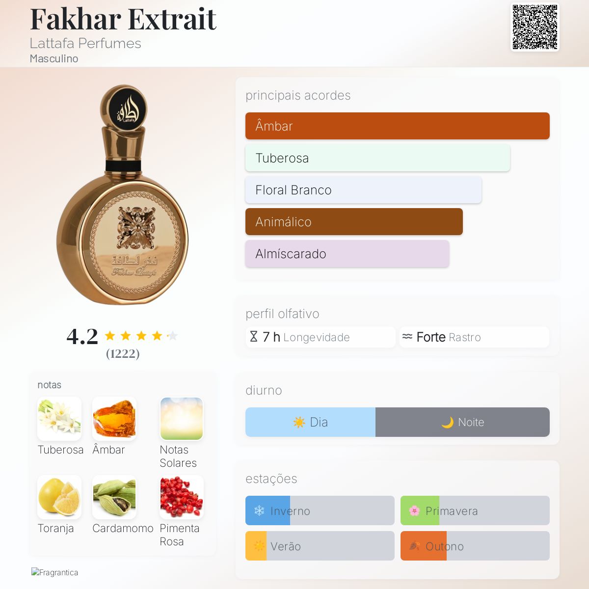2.ELE É PARECIDO COM O FAKHAR BLACK? Não. O Black é fresco e versátil (estilo YSL Y). O Extrait (Gold) é quente, ambarado, solar e muito mais luxuoso. São perfumes completamente diferentes para ocasiões diferentes.