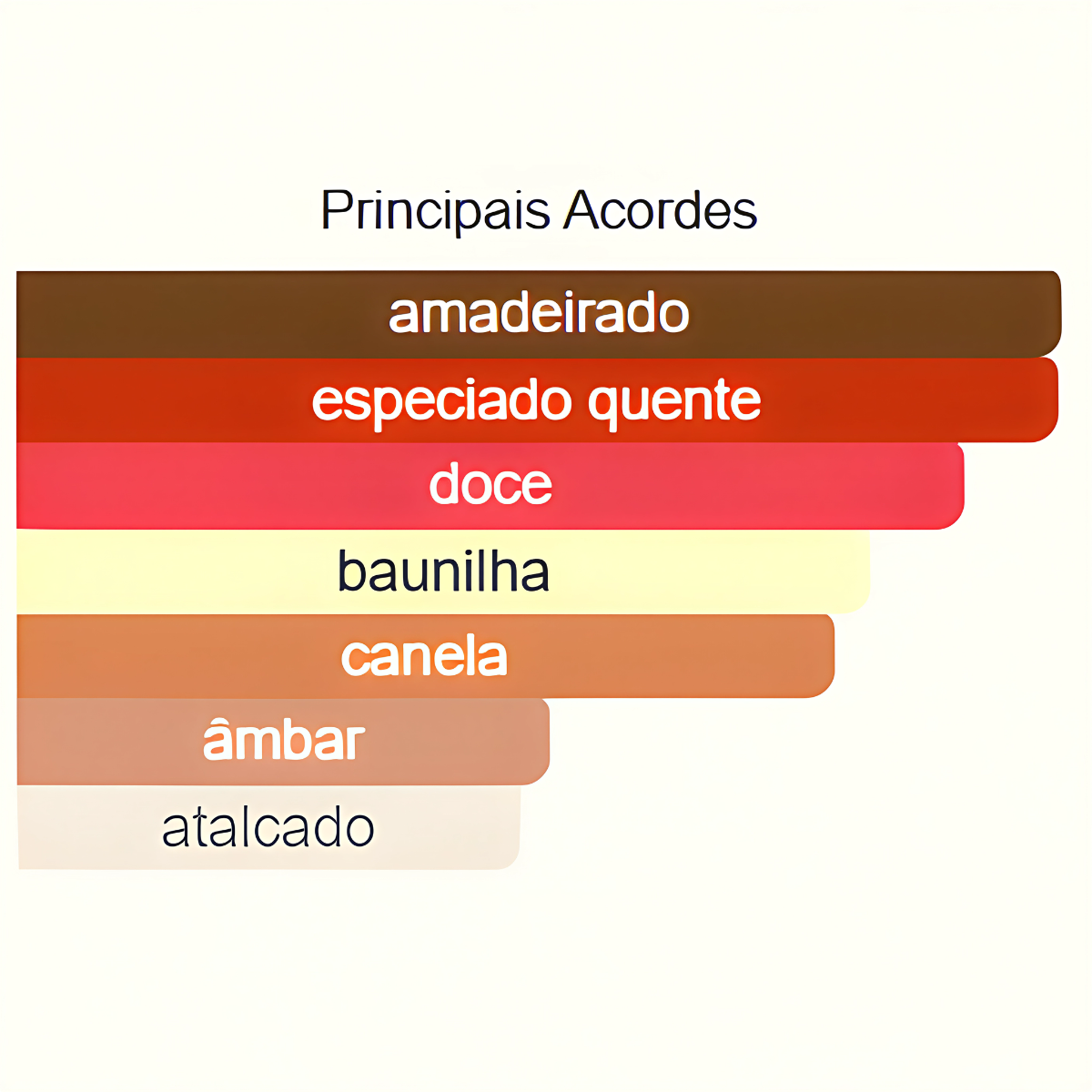 - Coração: Baunilha, Sândalo Nobre, Ládano, Cashmere e Chocolate Amargo.
