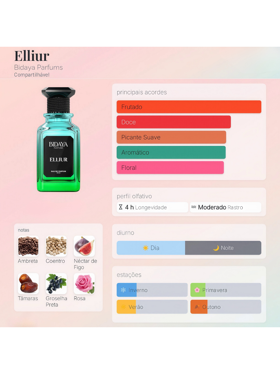 • Fundo de Ambreta e Tâmaras que entregam uma fixação densa e luxuosa