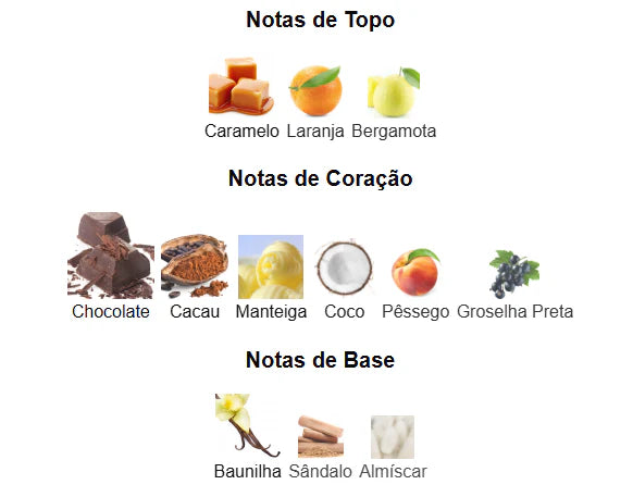 • Coração: Chocolate, Cacau, Coco, Manteiga, Pêssego e Groselha Preta.