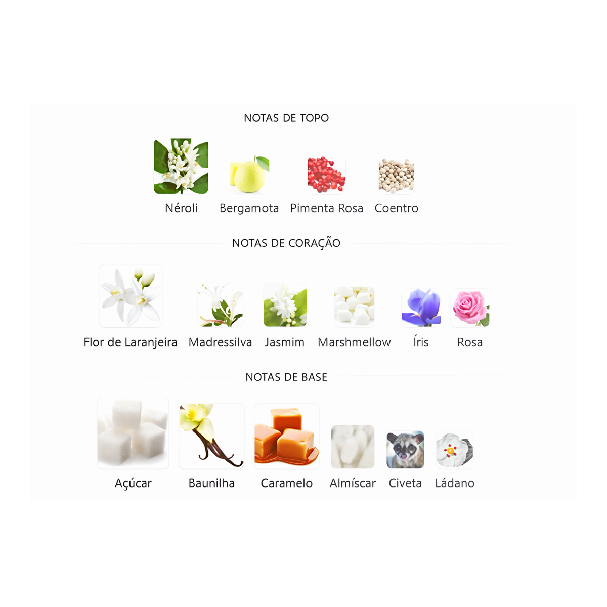 • Coração: Baunilha, Fava Tonka, Cacau e Flor de Tabaco.