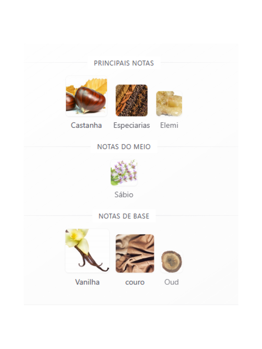 - Fundo: Patchouli da Indonésia, Âmbar Dourado e Musgo de Carvalho.